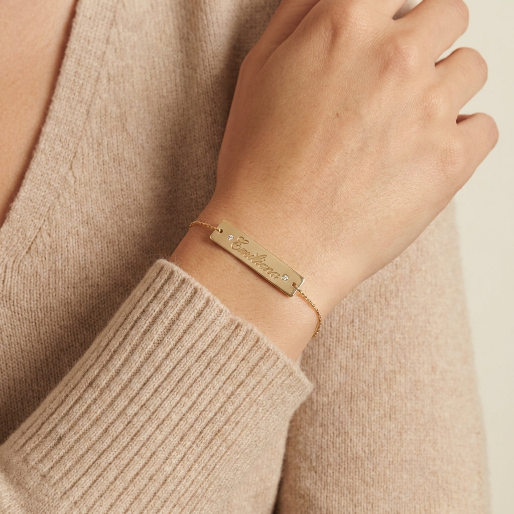 Meet your new everyday signature, the Name Bar Bracelet with side Zircons in Gold 14Kt. Designed for adults who love minimalist luxury, timeless fine jewelry, and modern styles, these elegant name bar bracelets add an instant glow to any look. Their personalized name bar charm adorned with sparkling zircons sits beautifully on the wrist, making them the perfect piece for daily wear or special occasions.