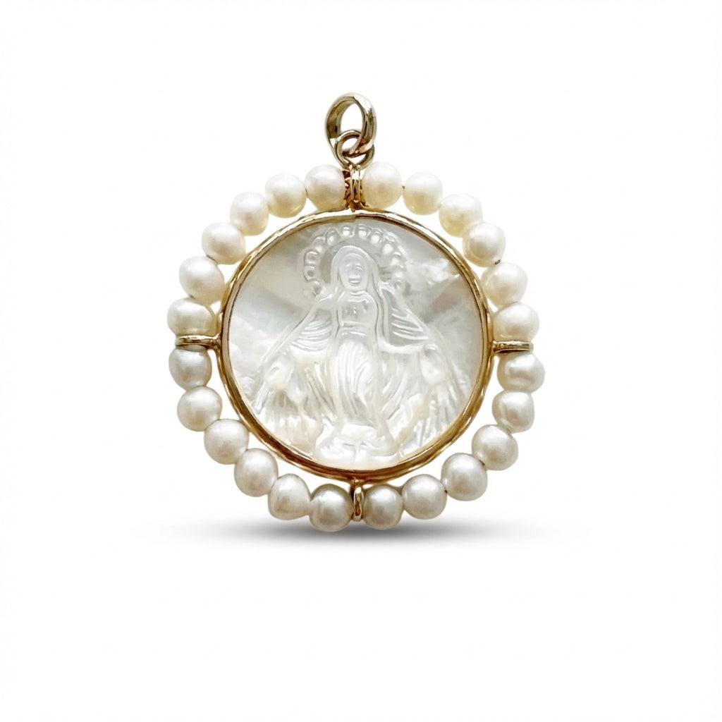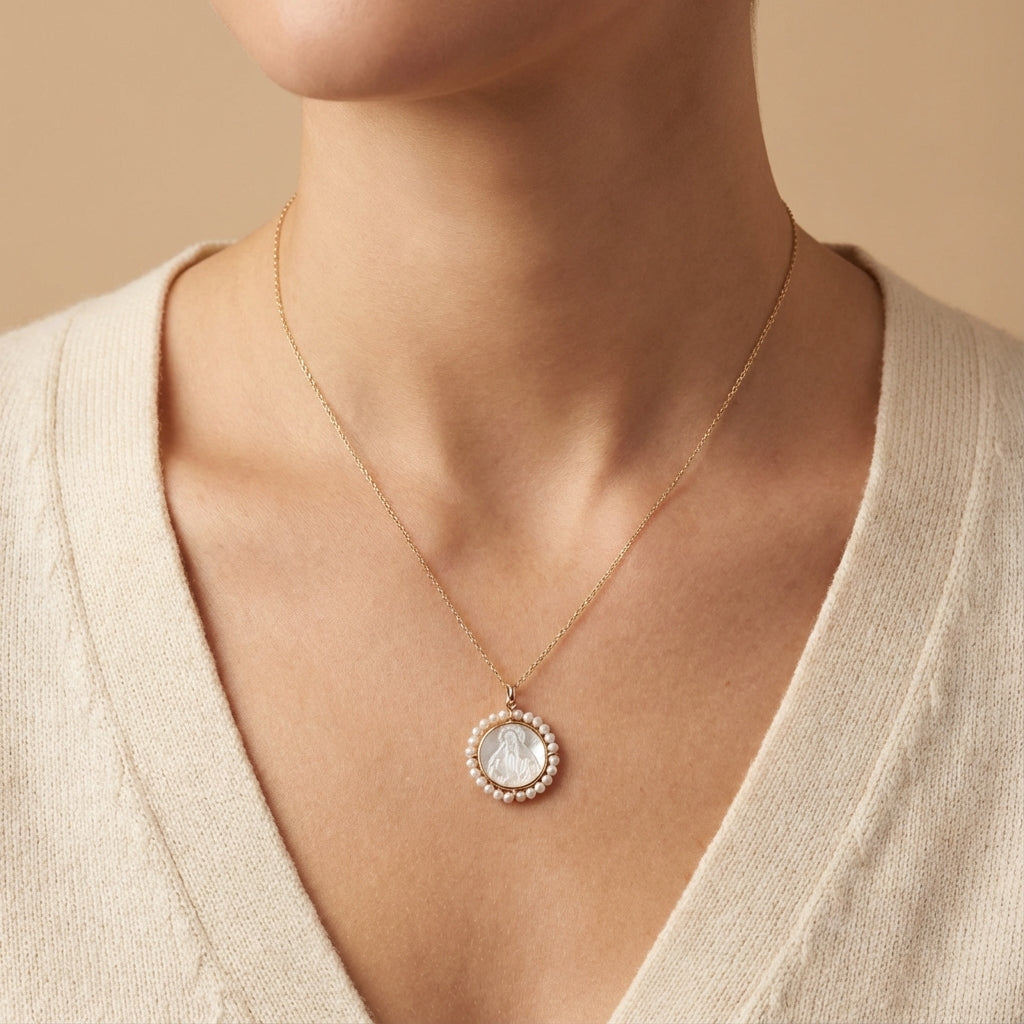 Meet your new everyday signature, the Pearled Religious Mother of Pearl Medal in Gold 14Kt. Designed for adults who love minimalist luxury, timeless fine jewelry, and modern styles, these charms add an instant glow to any look. Their intricate mother of pearl carving surrounded by lustrous pearls sits beautifully on the neck, making them the perfect piece for meaningful everyday wear.