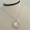 Surrounding this sacred medallion is a delicate halo of lustrous freshwater pearls, each carefully selected for its pristine quality and organic beauty. This thoughtful arrangement enhances the medal's grace, creating a piece that feels both deeply personal and undeniably luxurious. The subtle iridescence of the mother-of-pearl combined with the soft sheen of the pearls and the warm gleam of gold plating offers a captivating play of light, ensuring this necklace beautifully complements any ensemble.