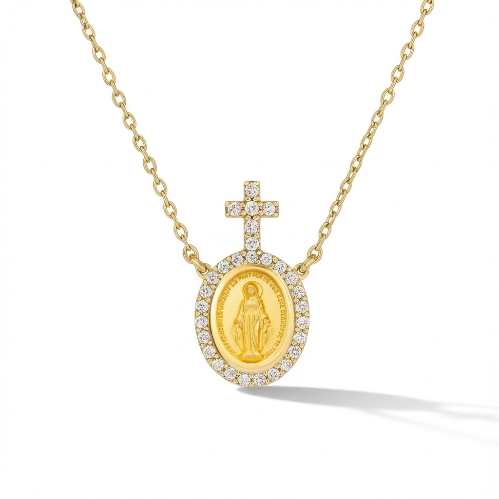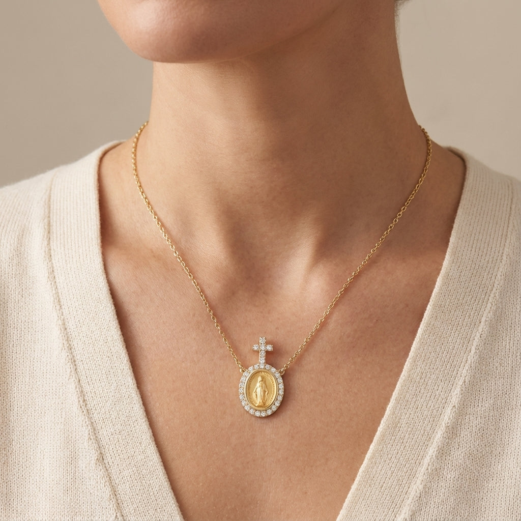 • Miraculous Medal pendant with a diamond halo and a diamond-studded cross, offering a symbolic and radiant design for a clean, polished, modern aesthetic