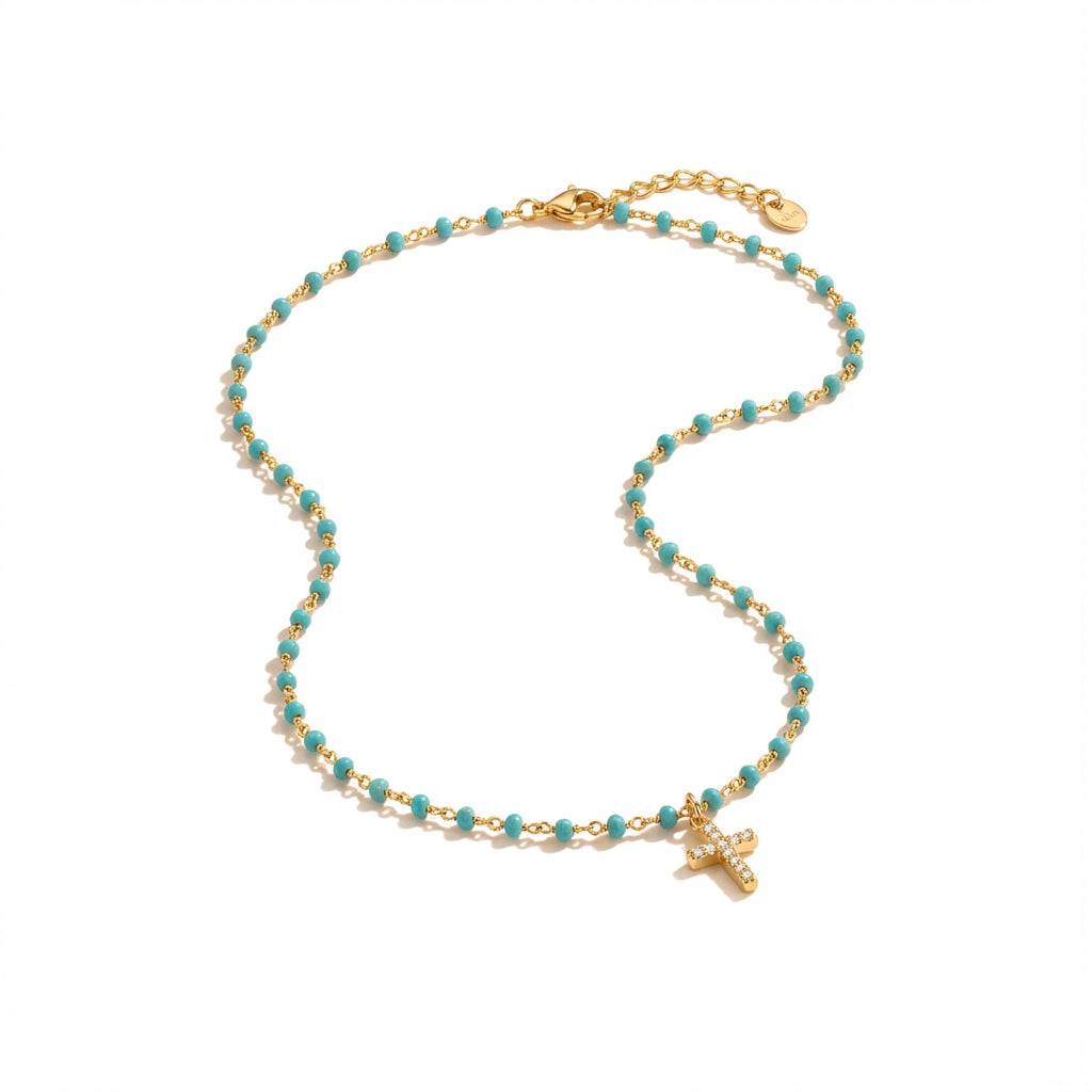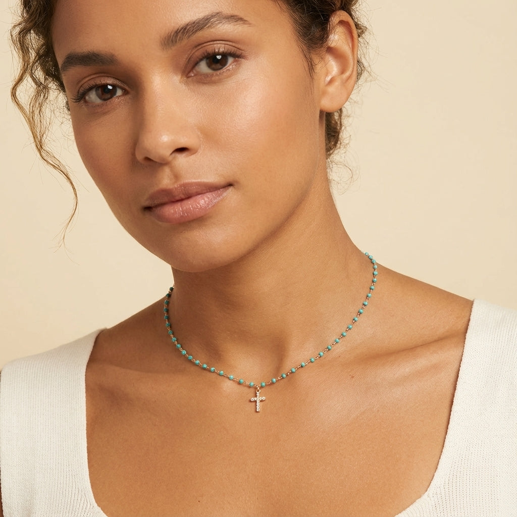 Meet your new everyday signature, the Mini Cross Bead Necklace in Golden Plated Silver. Designed for adults who love minimalist luxury, timeless fine jewelry, and modern styles, this delicate beaded necklace adorned with a mini cross charm adds an instant glow to any look. Its elegant beaded chain and sparkling mini cross pendant sits beautifully on the neckline, making it the perfect piece for adding a meaningful, sophisticated touch to any daily ensemble.