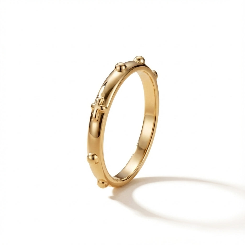 Designed for adults who love minimalist luxury, timeless fine jewelry, and modern styles, this rosary-inspired ring adds an instant glow to any look. Its elegant rosary-inspired design with delicate beads and a subtle cross sits beautifully on the finger, making it the perfect piece for everyday elegance and personal expression.