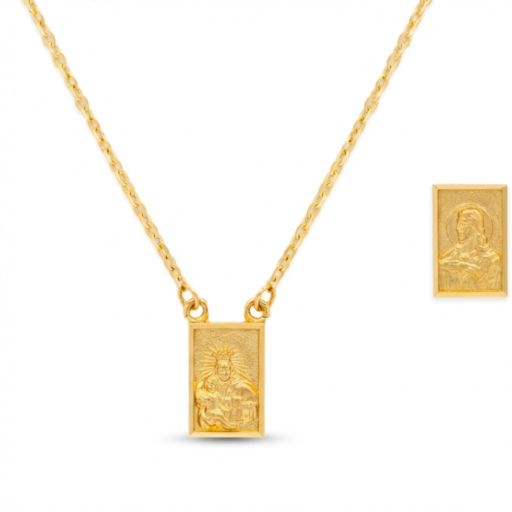 Embrace timeless faith with our Squared Scapular Necklace, expertly crafted from radiant 14kt gold. This elegant piece features two distinct rectangular pendants: one beautifully depicts the revered Virgin Mary cradling the Child Jesus, while the other showcases the sacred image of the Sacred Heart of Jesus. Connected by a delicate chain, this devotional necklace is a sophisticated symbol of spiritual protection and devotion, designed for everyday wear or special occasions.