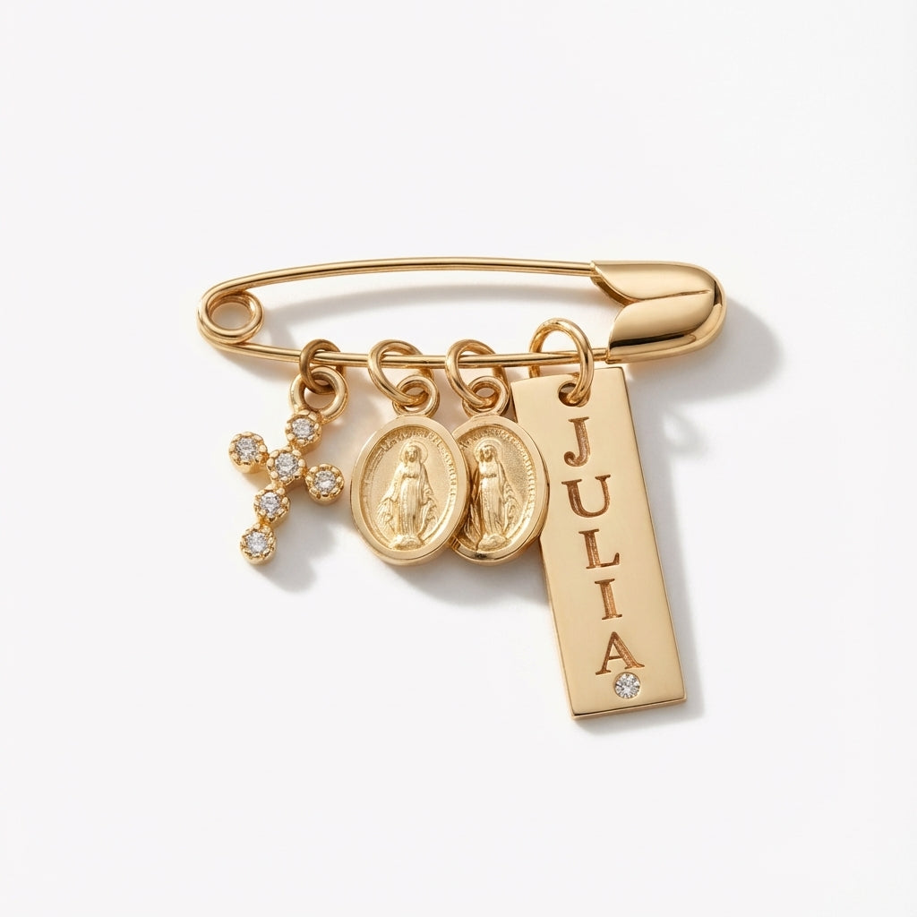Meet your new everyday signature, the Simple Safety Pin in Gold 14Kt. Designed for adults who love minimalist luxury, timeless fine jewelry, and modern styles, these personalized charm-adorned safety pins add an instant glow to any look. Their unique collection of charms and an engraved name tag sits beautifully on clothing, a bag, or other accessories, making them the perfect piece for expressing personal style and faith.