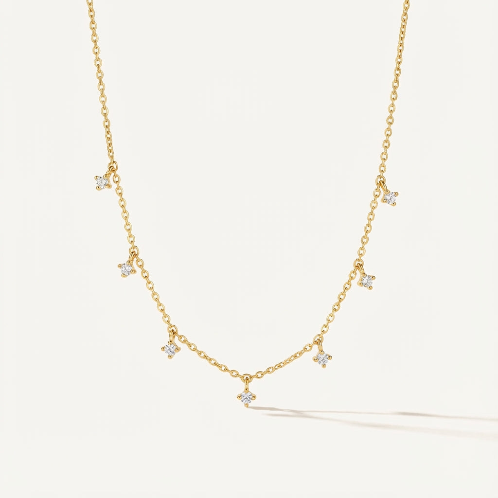 Meet your new everyday signature, the Dangle Necklace in Golden Plated Silver. Designed for adults who love minimalist luxury, timeless fine jewelry, and modern styles, these delicate chain necklace adorned with shimmering dangle stones add an instant glow to any look. Their shimmering dangle stones sits beautifully on the neck, making them the perfect piece for effortless everyday elegance.